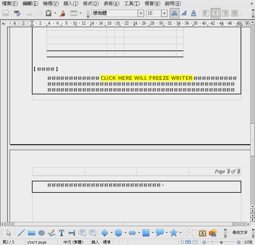 Created attachment 66038 [details] The second file that freezed Writer. Dear all: I uploaded the second and third file (freeze2.odt and freeze3.odt) that would freeze Writer. In freeze2.odt, delete the red area and click the yellow area, you will see a freezed Writer. Please take a look at the Paragraph 7 on page 3. There is only one line in table on page 3 after you deleted the red area of Paragraph 6, the "only one line in table on page 3" may make Writer get into the loop of creating and deleting a new page for the large table. I guess this is why Writer freezed. On the other hand, the file freeze3.odt show us a different example. The freeze3.odt had no page3, but if you add any character in Paragraph 6 or Paragraph 7 to make a new line for pushing Writer to creat page 3, Writer will freeze. In freeze2.odt and freeze3.odt, we all see the "only one line in table on page 3" make Writer freeze. So I guess this maybe a problem of table behavior. But I think this may involve something wrong about chinese (or CJK) paragraph dealing mechanism in table, because I only meet this problem when I typing Chinese characters in a very long table ( and this table must goes across many pages). Thanks a lot~