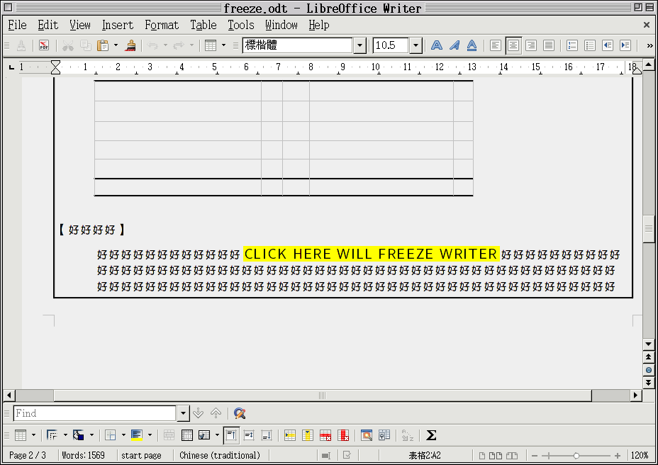 Dear Roman Eisele: Version before 3.4.6 is not available to download, but I can reproduce this bug on OpenOffice.org 3.3.0, I think this bug may be inherited from OpenOffice.org. Should I test any earlier version of OpenOffice.org? A difference should be noted, in OpenOffice 3.3.0., click " CLICK HERE WILL FREEZE WRITER " won't freeze Writer, but typing any character in that yellow area still freeze Writer. Additionally, using other chinese truetype font sometimes meet this bug, it occurs while inserting some chinese words in page one. But it's hard to find the way to reproduce so far. Roughly, I think this problem involved: (1) a table splits across pages; (2) a table cell contains chinese characters, some paragraphs in the table cell go across pages. Thank you.